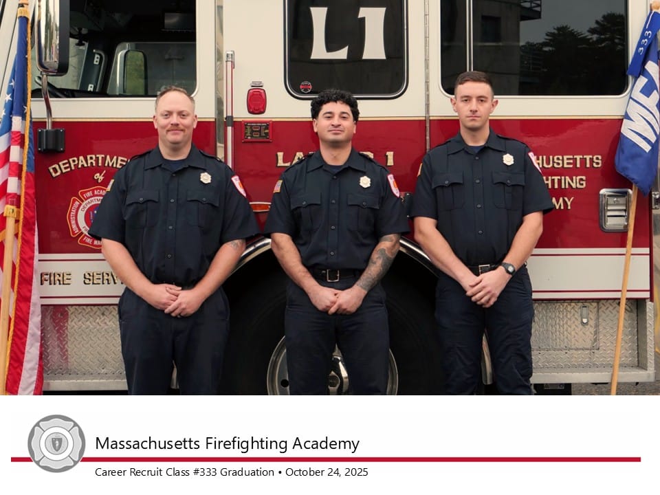 Please join our department in congratulating Jamie Burdge, Robert Christopher and Brendan Smith on their graduation from the Massachusetts Firefighting Academy. We wish them well…